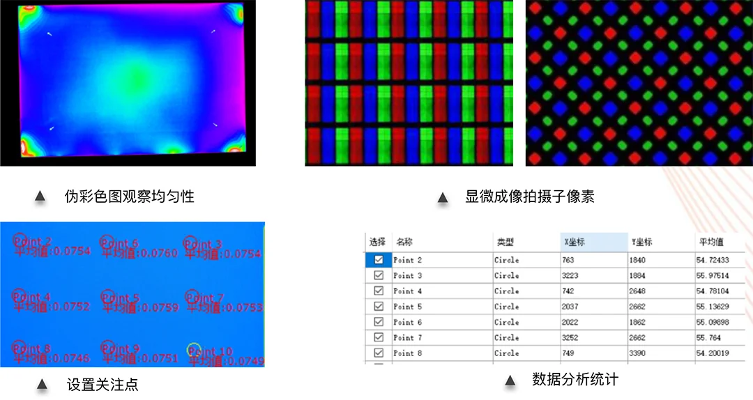 同步頻率設置測試,減少測試數據波動偏差 。 偽彩色顯示直觀評估亮色度均勻性