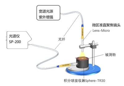 SP-200-TR系統由光源發射和接受兩個部分組成。光源發射端通過紫外增強的寬譜光源(380-3000nm)發出穩定的寬譜光源,光源通過光纖和準直透鏡(配微區準直聚焦透鏡可以實現0.7-2mm的測量區域)照射到待測樣品上,透過樣品后進入接收光線的積分球接收器,高質通過光纖進入光譜儀。